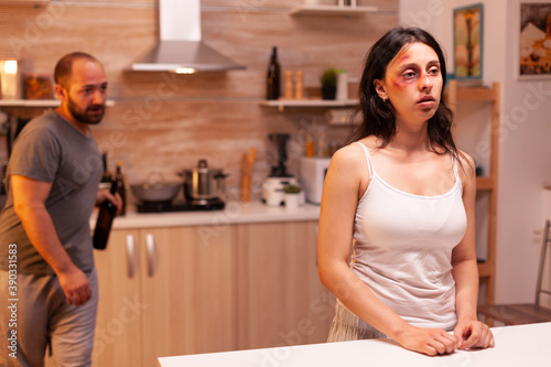 Woman being victim of domestic violence from alcoholic husband. Violent aggressive man abusing injuring terrified helpless, vulnerable, afraid, beaten and panicked wife.