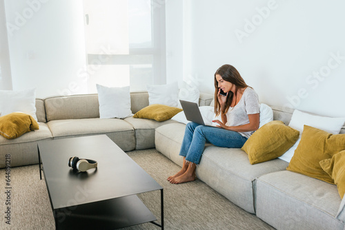 woman, laptop, pastime, online, living room, couch, browsing, cyberspace, connection, typing, home, light, style, apartment, leisure, flat, dwell, attractive, residential, serious, calm, condensed, sharpened, surfing, device, contraption, sofa, modern, female, free time, digital, using, domestic, search, cushion, remote, attentive, pillow, portable, inside, independent, individuality, alone, emotionless, peaceful, smartphone, phone call, conversation