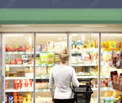 aisle, buying, choice, choosing, comparison, consumerism, client, decision, examining, female, fitness, food, deep freezer, freshness, girl, grocery, healthy eating, holding, label, lifestyle, looking, mall, market, meat, merchandise, middle-aged, milk, package, people, price, raw, reading, refrigerated, refrigerator, retail, sale, section, shopping, standing, store, supermarket, uncertainty, woman, woman, yogurt, young