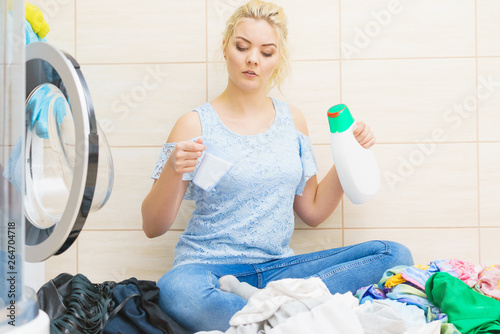 laundry, washing, detergent, gel, powder, machine, liquid, laundered, thinks, thinking, choosing, blond, young, woman, container, domestic, chemical, household, soap, housework, colourful, clean