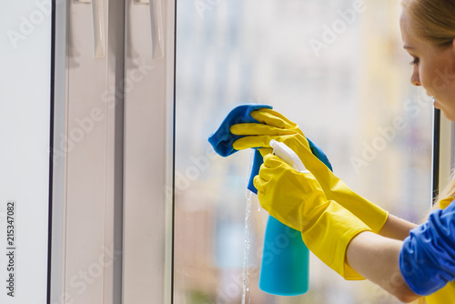 cleaning, window, home, spray, pane, cleaner, housework, glasses, rag, detergent, woman, laundered, glove, yellow, maid, clean, clothes, house, blue, person