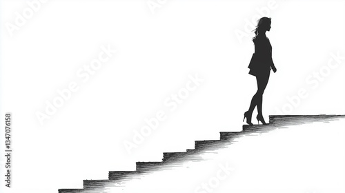 Woman climbs up the high career stairs. Black sketch silhouette