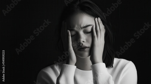 Woman closing her eyes tightly, holding her forehead in response to intense stress