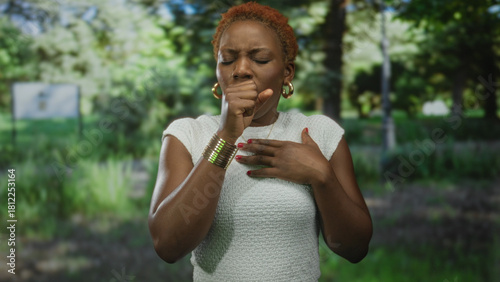 woman, hand, cough, park, african, american, young, outdoors, nature, female, discomfort, disease, disease, disease, ailment, infection, disease, distress, pain, person, adult, coughing, hacking, tree, grass, signs, paseo, foliage, medicals, breathing, throat, lung, symptom, virus, germ, health, wellness, contagious, contagion, malaise, fatigue, tiredness, weakness, fever, cold, viral