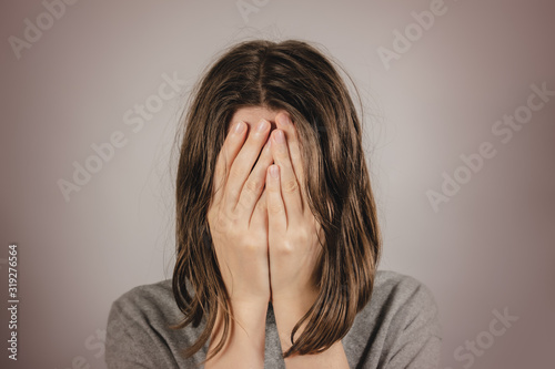 Woman covers face in hands. Concept of despair, depression, loss or mental condition