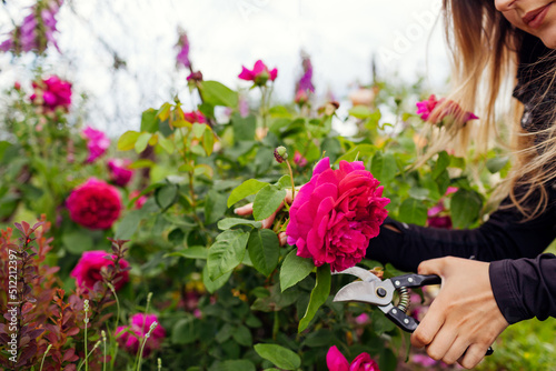 Woman cutting blooming rose flowers in summer garden. Gardener using pruner. William Shakespeare english rose