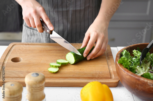 Woman cutting fresh cucumber at table, closeup