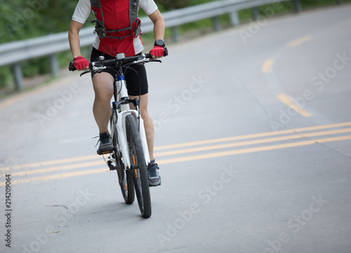 Woman cyclist riding mountain bike on road