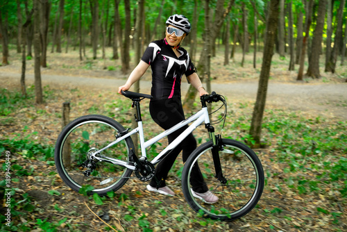 woman, bicyclist, bicycle, walking, forest, path, nature, trail, mountain bike, gravel, lifestyle, active, fitness, exercise, health, wellness, recovery, break, recreation, professional, gear, helmet, sunglasses, jersey, rider, athlete, training, physical exercise, cardio, summer, wood, sun, light, activity, leisure, journey, travel, hobby, person, sport, fresh air, energy, vitality, movement, equipment, safety