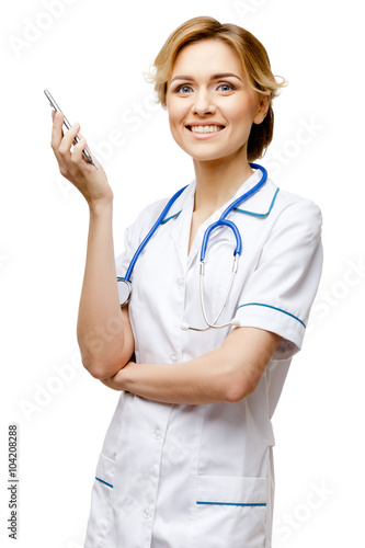 doctor, phone, on the phone, communication, young adult, isolated on white, medicals, studio shot, female, medicine, professional, stethoscope, professional occupation, nurse, one person, health, practitioner, caucasian, men at work, health care, woman, woman, portrait, health care, friendly, confidence, lifestyle, science, expertise, attractive, copy space, profession, clinic, specialist, job, uniform, confident, standing, beautiful, represent, blond, horizontal, girl, blond, indoor