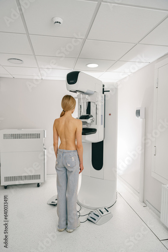 Woman doing mammogram x ray for breast cancer prevention screening at hospital. High quality photo