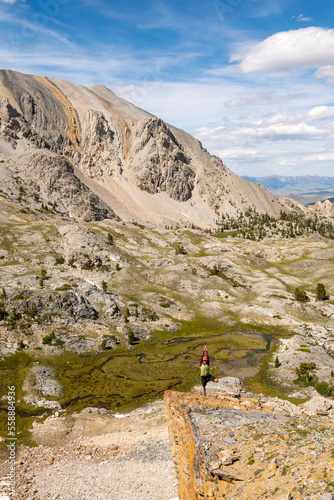 arms raised, balance, day, healthy lifestyle, hiking, idaho, mature adult, mountain, one person, outdoors, summer, sunny, us, vertical, wilderness, woman, yoga