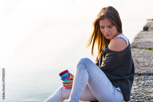 alone, beach, beautiful, breakfast, brown hair, calm, caucasian, coast, hot drink, coffee break, cup, dawn, drink, drinking, enjoying, fashion, happy, hipster, lifestyle, long hair, meditation, morning, mug, nature, new day, ocean, pretty, relaxing, ripple, sea, smiling, stylish, sunrise, waking up, water, wave, woman, young