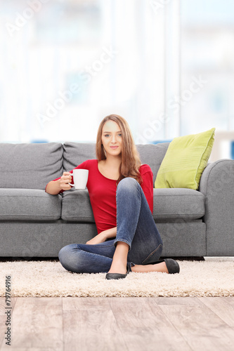 Woman drinking coffee seated by a modern sofa