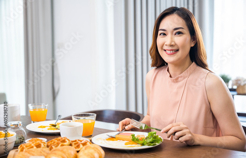 Woman eat fresh breakfast served food with beverage before go to work in the morning at home, Asian young female sitting kitchen table food having eating healthy breakfast at home