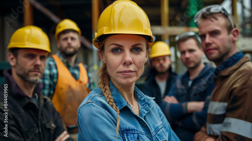 woman engineer in a yellow helmet at building site looking at camera. Successful architect and her team