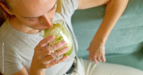 Woman Enjoying a Cup of Matcha Latte at Home