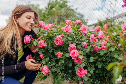 rose, flower, gardening, garden, leonardo, gardener, pink, woman, cutting, lifestyle, hobby, summer, bloom, blossom, enjoy, admire, scissors, care, shrub, grow, work, tool, happy, smiling, bush, farming, nature, leisure, fragrance, fresh, growth, scented, beautiful, people, agriculture, plant, green, holding
