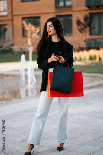 shopping, woman, fashion, style, bag, colourful, phone, confident, standing, piazza, modern, casual attire, trendy, accessory, street, full-length, outfit, seasonal, lifestyle, happy, enjoyment, leisure, retail, urban, beauty, elegance, brunette, architecture, environment, relaxed, day, cheerful, footwear, heel, social, consumer, market, city, vivid colors, shopping centre, contemporary