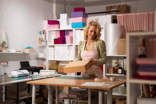 woman, entrepreneur, small business, workshop, packing, shipping, happy, smiling, owner, female, retail, e-business, box, craft, order, package, casual attire, apron, successful, startup, marketplace, seller, blond, adult, delivery, creativity, merchandise, product, working, self employed, distribution, fulfillment, creative, occupation, service, cheerful, preparing, parcel, mail, shipment, client, market, sale
