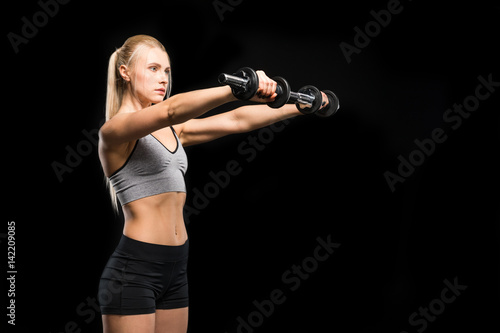sport, activity, horizontal, girl, young, adult, people, caucasian, sport, european, woman, sportive, fitness, exercise, exercising, attractive, athlete, training, dumbbell, concentrated, sporting, athletic, physical exercise, sporty, activewear, sportswoman, half face, one person, on black