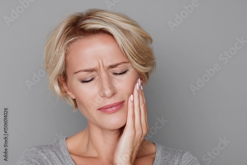 Woman experiences dental discomfort while holding her face in a neutral setting