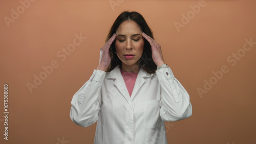 Woman experiencing stress in a white coat against an isolated brown background, highlighting a moment of concentration.