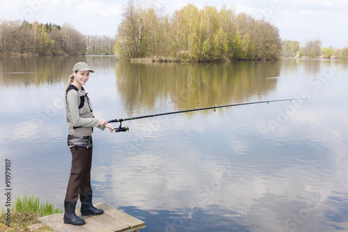 woman fishing on pier at pond