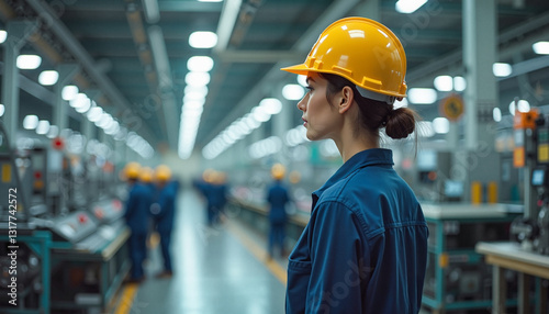 woman, industrial, workwear, machinery, engineer, research, production, construction, men at work, helmet, sharpened, factory, automation, confidence, adult, female, professional, labor, industry, action, equipment, manufacturing, no people, bustling, quality control, engineering, light, workplace, environment, standing, process, technology, hard hat, blue, safety, modern, efficiency, skilled, management, assembly, career, teamwork, innovation, responsibility, attention
