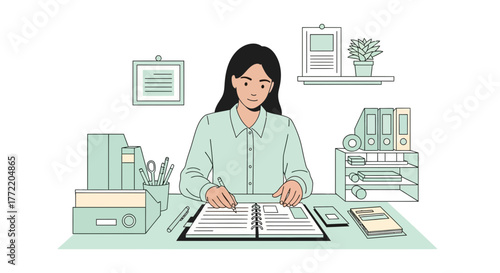 woman, desk, office, notebook, planning, organisation, writing, stationery, workspace, schedule, work, business, document, appointment, female, employee, career, activity, illustration, interior, routine, calendar, record, paper, working, diary, meeting, professional, lifestyle, project, table, focused, indoor, corporate, executive, manager, creative, vignetting, design, minimalist