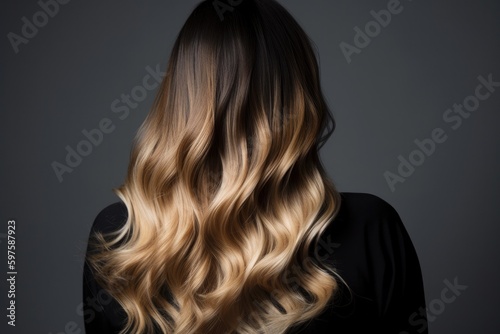 Woman from the back with balayage ombre hair dye technique, featuring a gradual transition from darker roots to lighter ends - Generative AI
