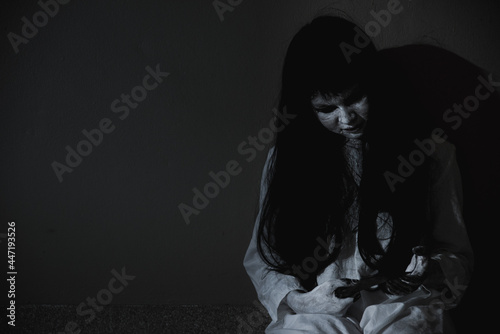 Woman ghost horror sitting her have knife arm in the house, halloween concept
