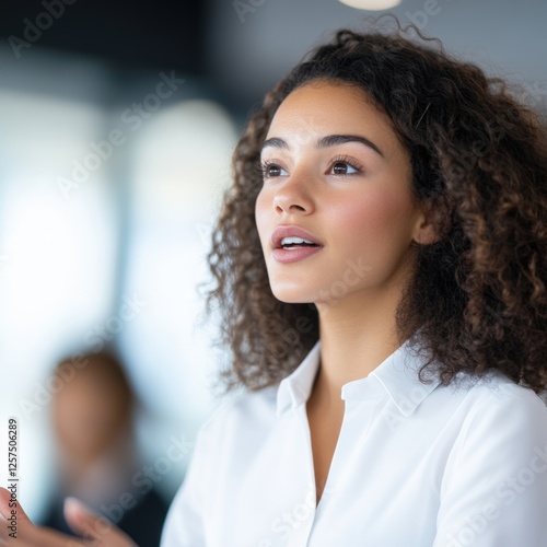 woman, business, presentation, office, corporate, speaker, speech, professional, curly hair, white shirt, conference, meeting, leadership, communication, confidence, executive, manager, leader, talking, entrepreneur, seminar, success, workspace, career, job, employment, work