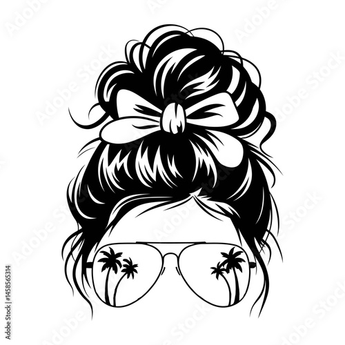 woman, hair, bun, bow, sunglasses, palm, tree, summer, beach, tropical, vacation, holiday, stylish, fashion, trendy, coiffure, messy, cool, chic, female, lady, girl, portrait, retro, silhouette, black, white, design, graphic, head, casual attire, modern, aesthetic, hipster, fun, relaxed, vibe, outline, vector, art, style, vignetting, leaf, beauty