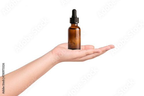 Woman hand holding essential oil with dropper , Liquid Essential , Collagen serum and organic aroma oil isolated on white background.
