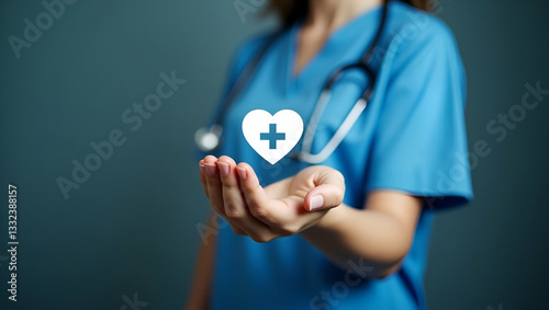 Woman hand holding plus icon for healthcare medical icon representing health insurance health concept access to welfare health with copy space concept as Womans hand holds a plus icon representing hea