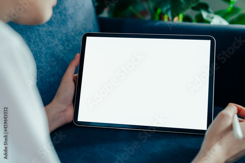 Woman hand using digital tablet and the screen is blank.