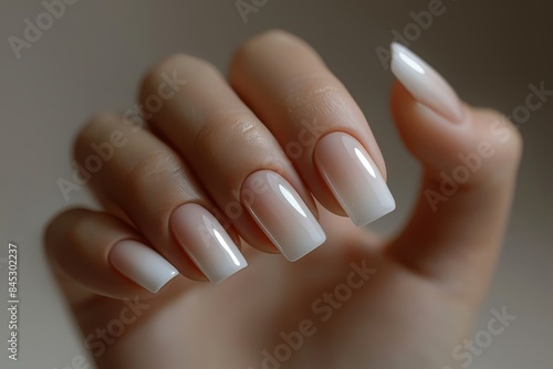 woman hand with French manicure on square nails on neutral background, design of nails, nail care