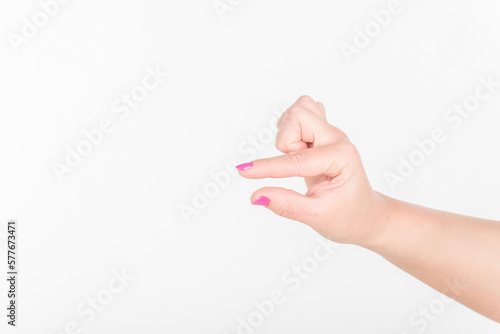 Woman Hand with Polish Fingers on White Background. Shows and Empty Space for Small Piece of Item.