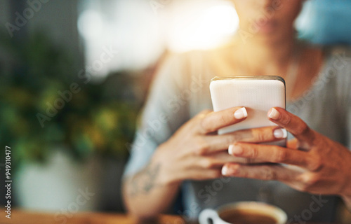 Woman, hands and typing with phone at cafe for social media, connection or reading news. Closeup, female person or browsing on mobile smartphone for online communication, app or space at coffee shop