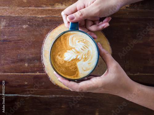 Woman hands holding mug of hot coffee drink