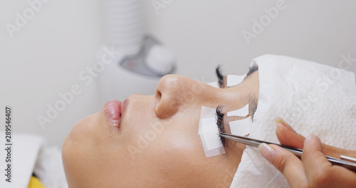 Woman having eyelash extension in beauty salon