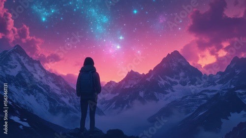 Woman hiker gazing at vibrant night sky, majestic mountains, dreamy cloudscape; travel poster