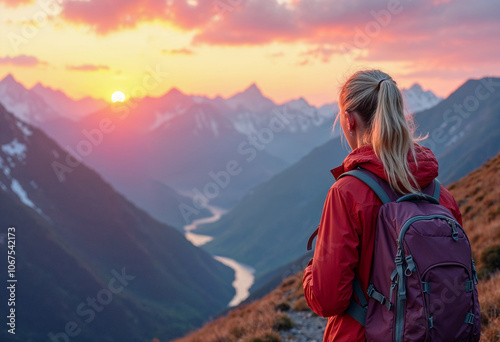 Woman Hiking through Mountain Range at Vibrant Sunset Hour