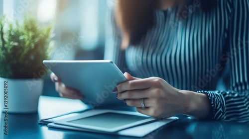 technology, device, tablet, touch, screen, hand, finger, ring, nail, work, office, modern, business, reading, connection, communication, digital, information, closeup, person, woman, indoor, desk, table, stripes, shirt, fashion, elegant, lifestyle, accessory, surface, blurred, plant, green, pot, light, professional, sharpened, view, contemporary, working, meeting, browsing, app, interface, online, education, studying