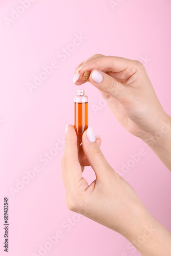 Woman holding bottle of essential oil on pink background, closeup