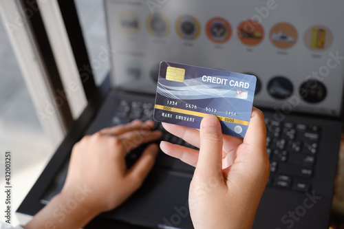 woman holding credit card and use laptop for with shopping online. Online payment concept. - Image