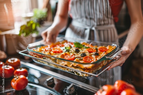 woman, hand, hold, lasagna, baked, fresh, cheese, tomatoes, basil, kitchen, red, warm, lighting, cosy, inviting, home, cooked, homemade, italian, food, pasta, dinner, meal, photo, styling, hairdresser