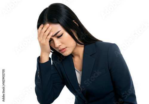 Woman Holding Head in Frustration Emotionally drained businesswoman dealing with stress or burnout