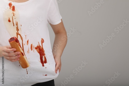 Woman holding hotdog and showing stain from sauce on her shirt against light grey background, closeup. Space for text